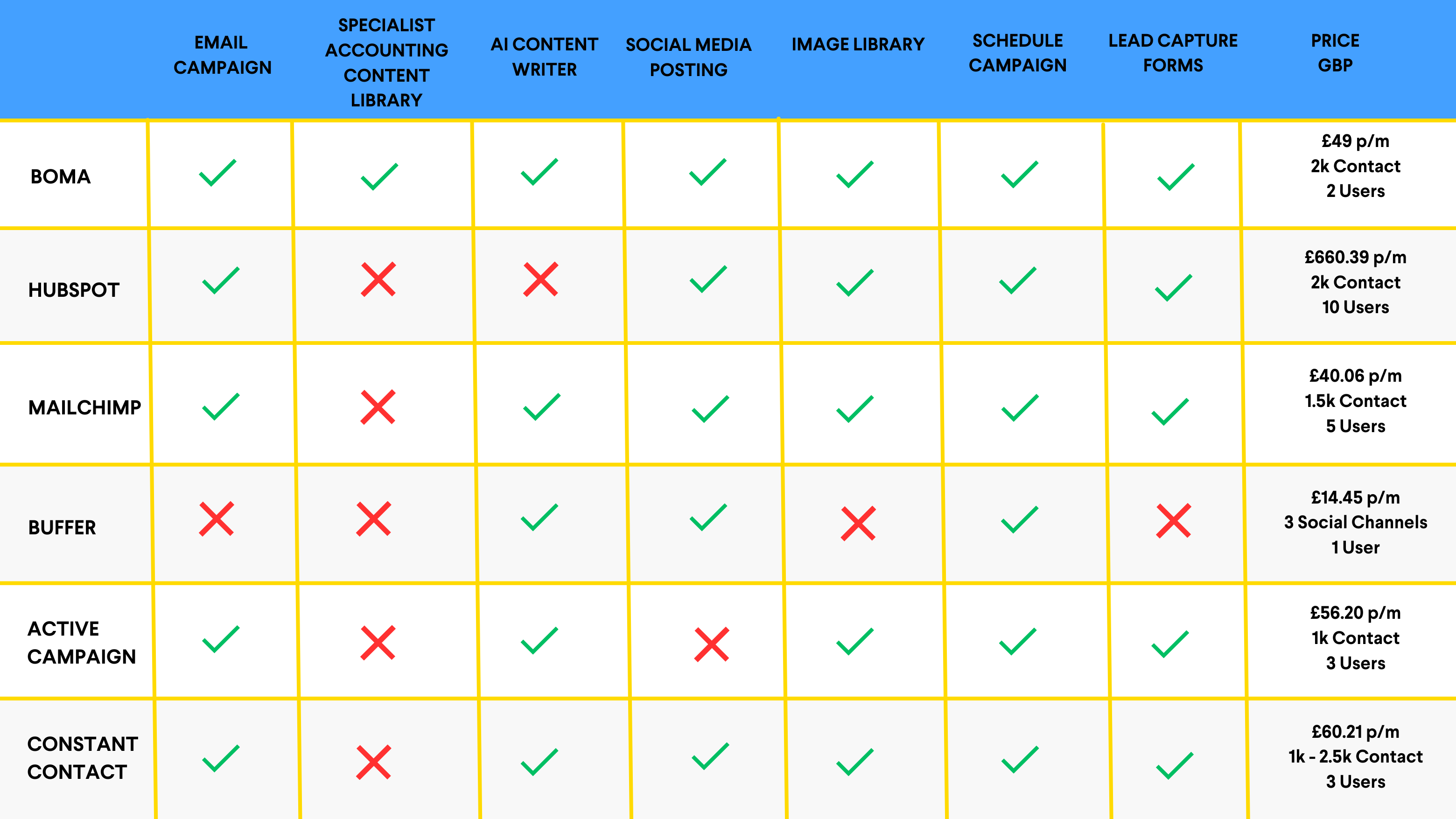 See how BOMA stacks up vs other marketing platforms